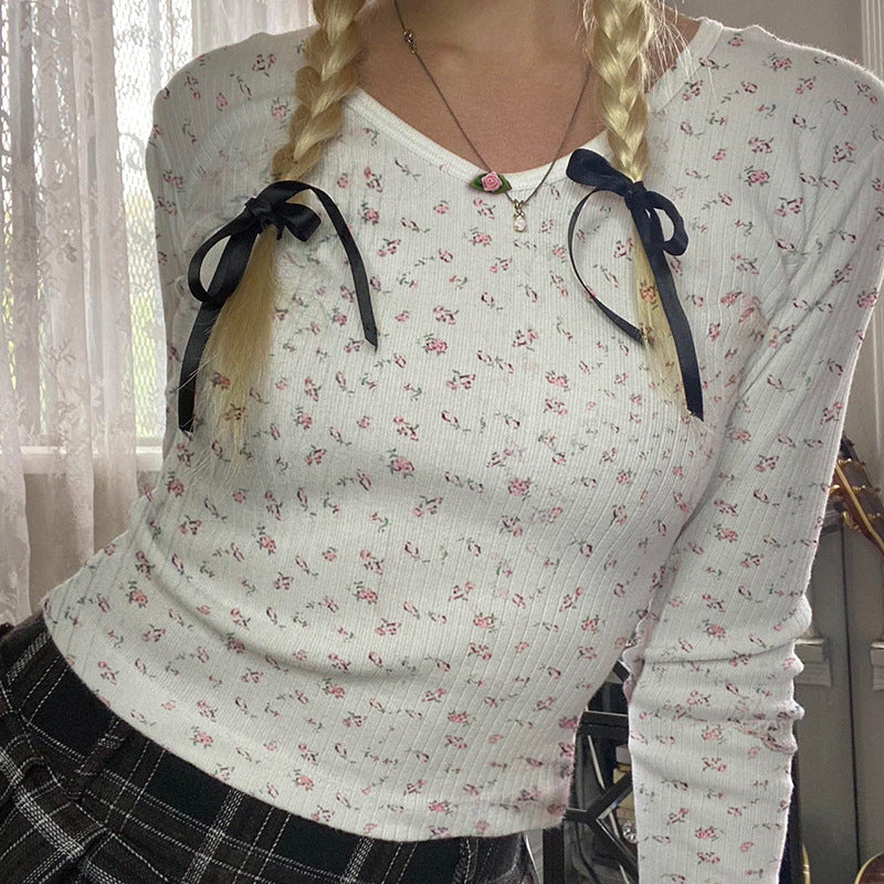 Introducing our Aesthetic Floral Print Long Sleeve Tee �a delightful blend of comfort and style in a charming white hue. Crafted from high-quality knitted polyester. this tee features a pattern of small florals. making it a perfect choice for those embracing aesthetic. soft girl. downtown girl. or cottagecore styles.