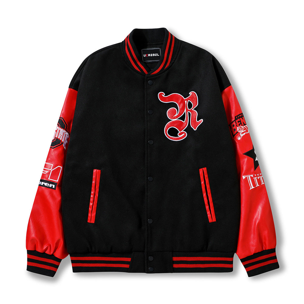 ï»?span data-mce-fragment="1">Back to school with these vintage styled cosy jackets. Cuts to a relax silhouette. features dropped pu leather paneled sleeves detail. with letter embroidery. contrast striped detail and button fasten design.