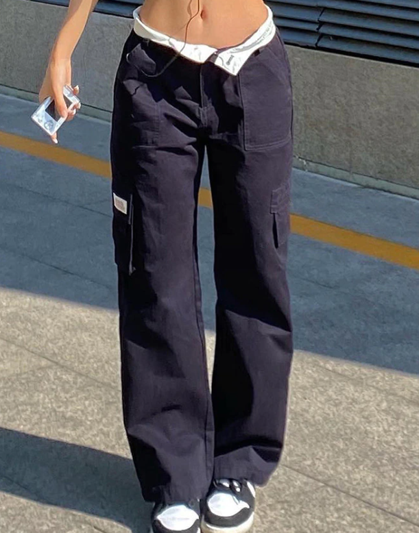 ï»?span data-mce-fragment="1">Made from cotton denim fabric. these vintage cargo jeans shaped to a straight-leg fit. features fold over waistband with letter embroidered detail. with multi cargo pockets patched and a zip button fastening design.