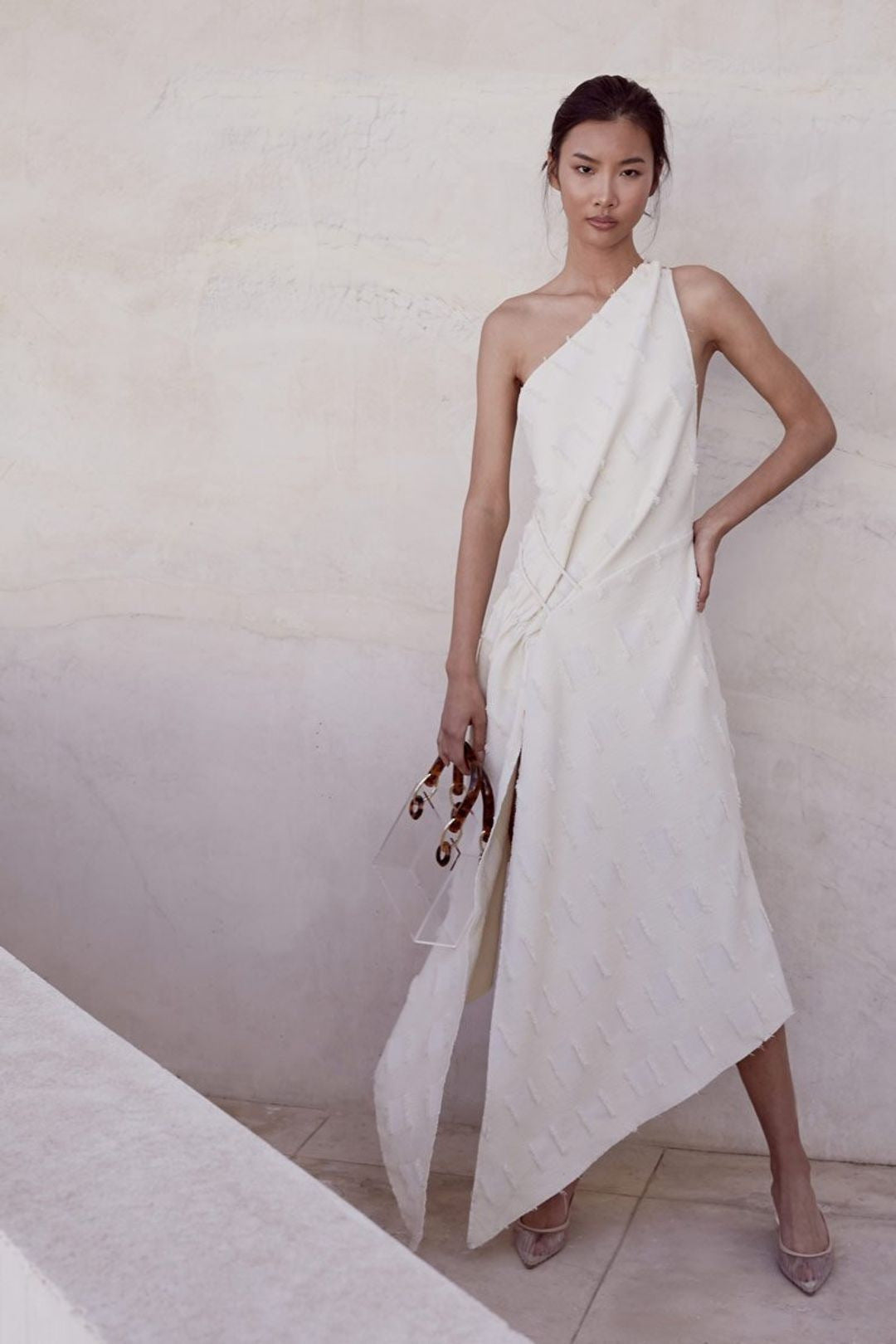 Light weight, linen blend fabrication offering a drape through the silhouette