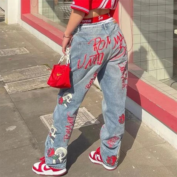 Embrace a blend of casual. street. vintage. preppy. punk. and hip-hop styles with these jeans. The unique feature of painted skull flowers adds a touch of artistry and personality to your outfit. making a bold fashion statement.