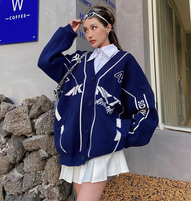 Get these cosy warm cardigans for winter edits. Cutting to a relax silhouette. features letters and stitched with contrast rope around. with drop shoulders and button fasten design.